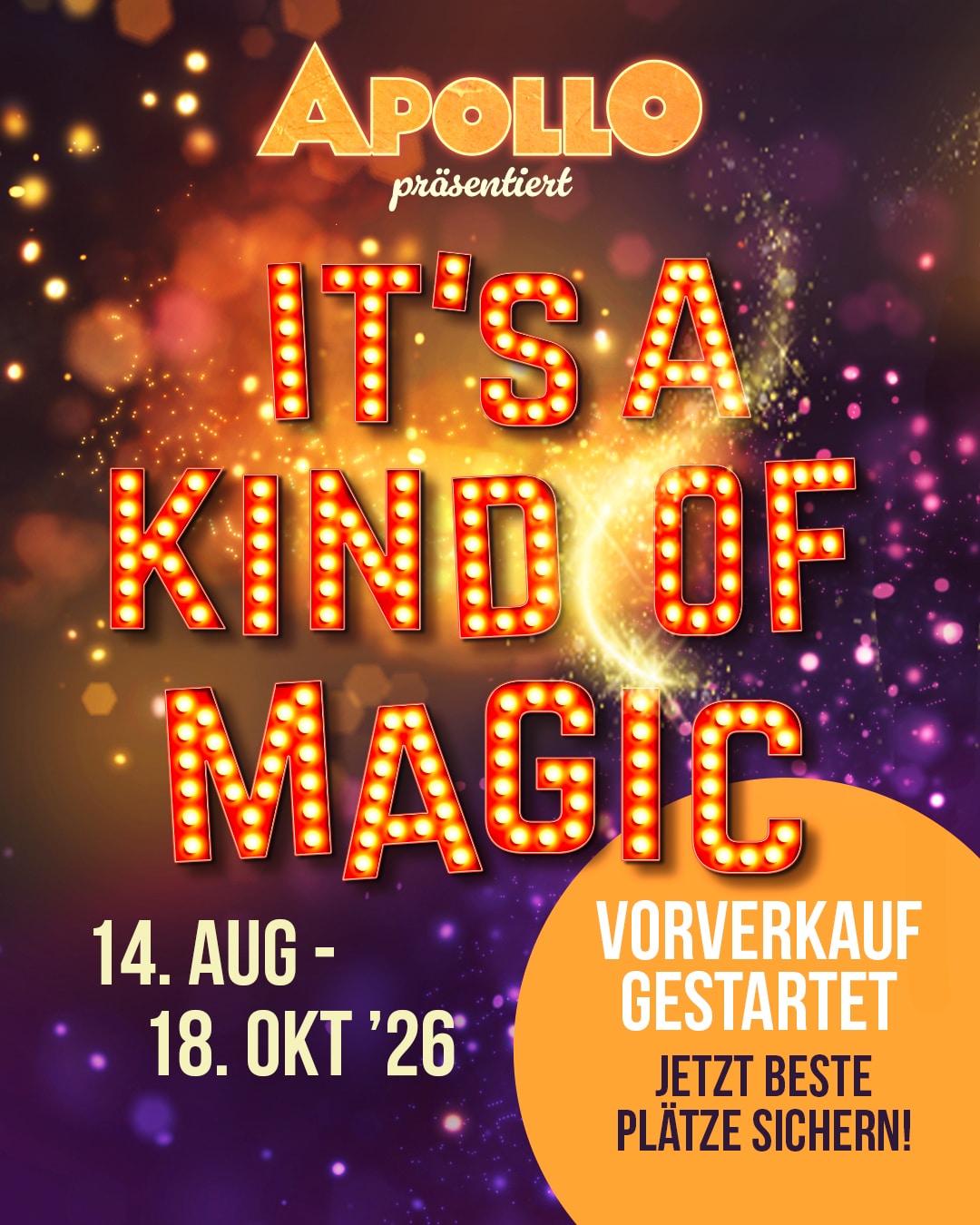 Der Sommer 2026 wird magisch. Tauchen Sie ein in eine Welt, in der die Grenzen zwischen Realität und Illusion verschwimmen. Ab dem 14. August 2026 entführen wir Sie mit unserer Show „It’s a Kind of Magic” in ein neues Varieté-Abenteuer voller überraschender Wendungen. Dinge verschwinden, erscheinen aus dem Nichts und sorgen für Staunen, Lachen und magische Wow-Momente.