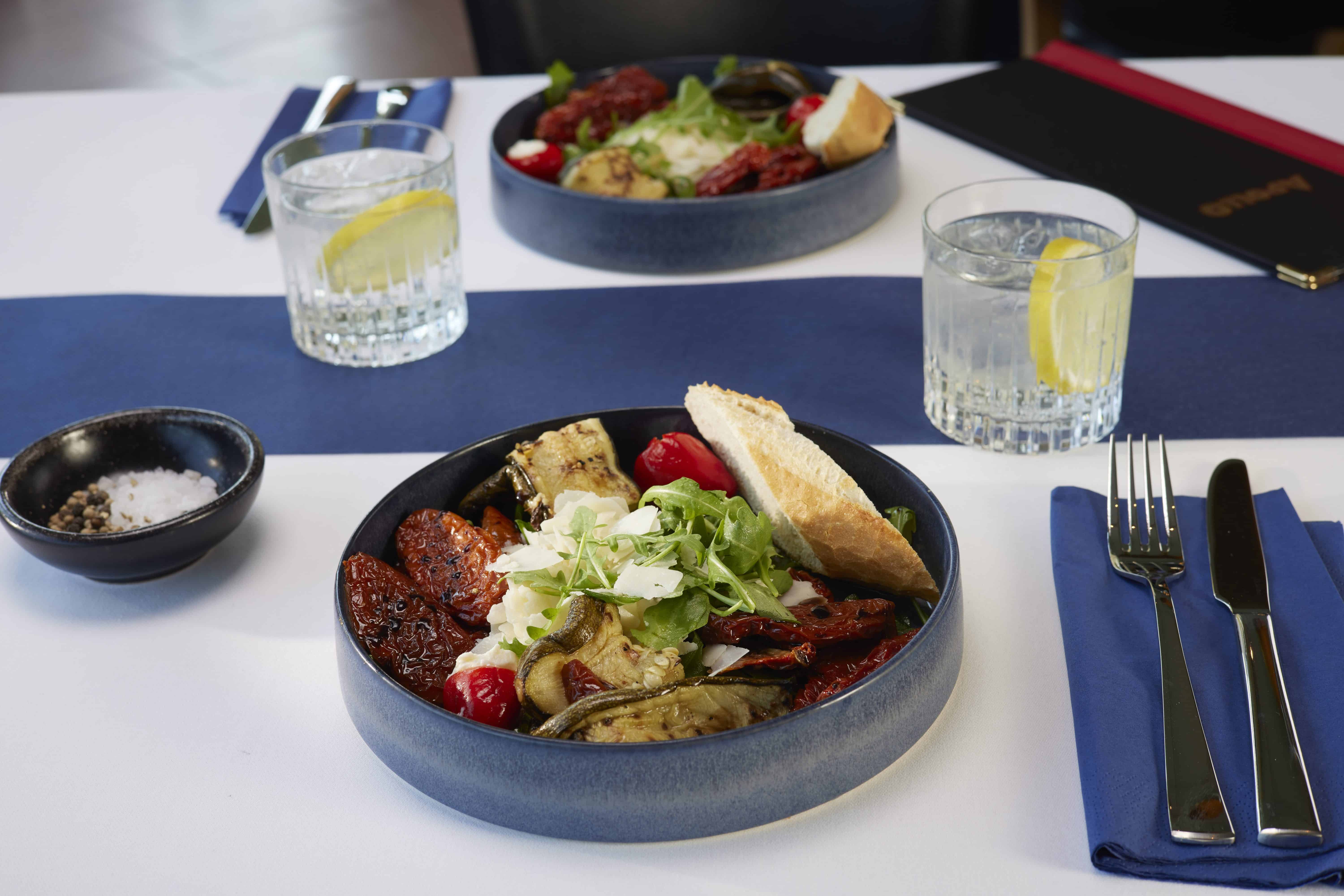 Antipasti Bowl mit gegrillter Zucchini, getrockneten Tomaten an mit Parmesan gefüllte Kirschpaprika und mit Rucola & Parmesan Flakes verfeinert
